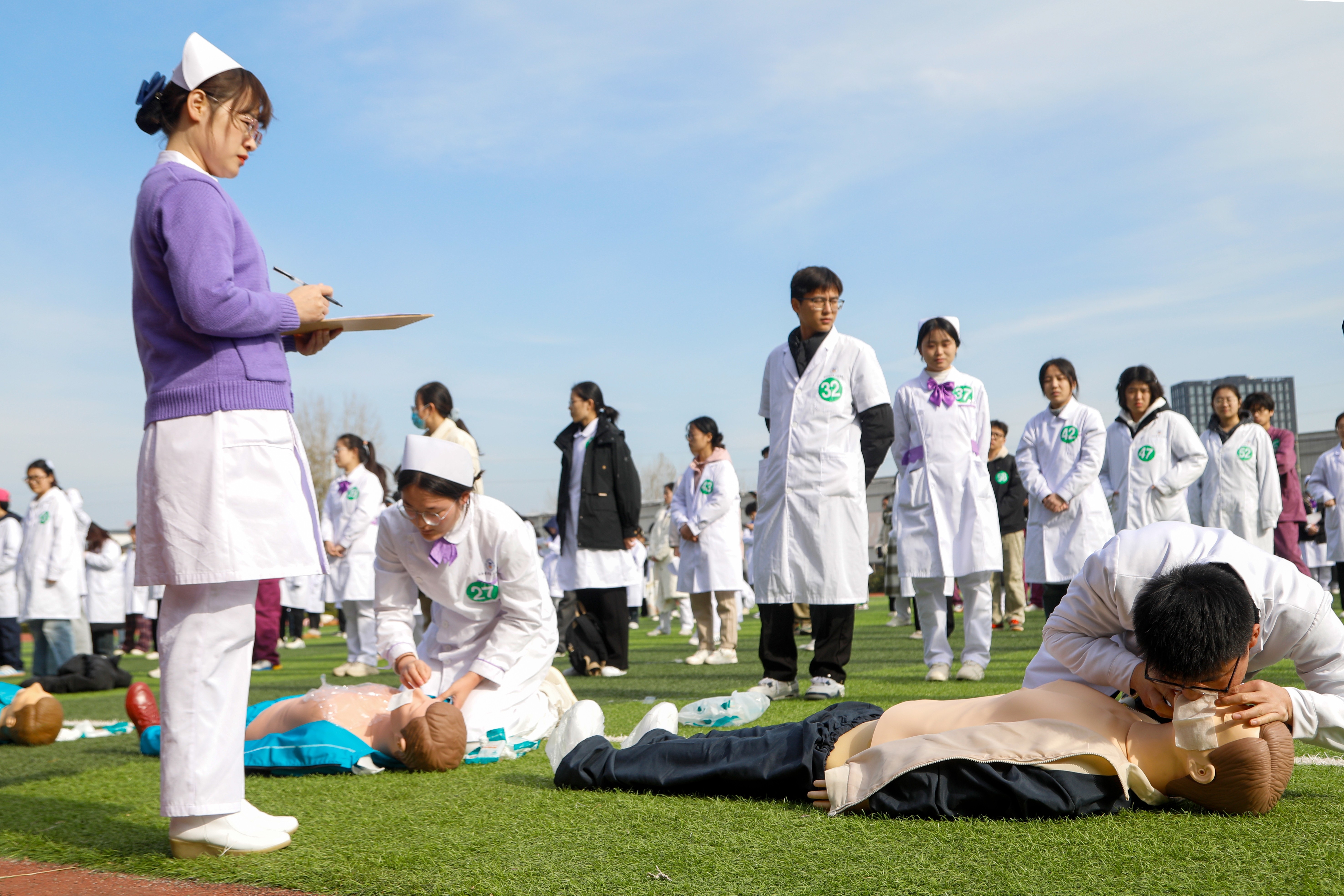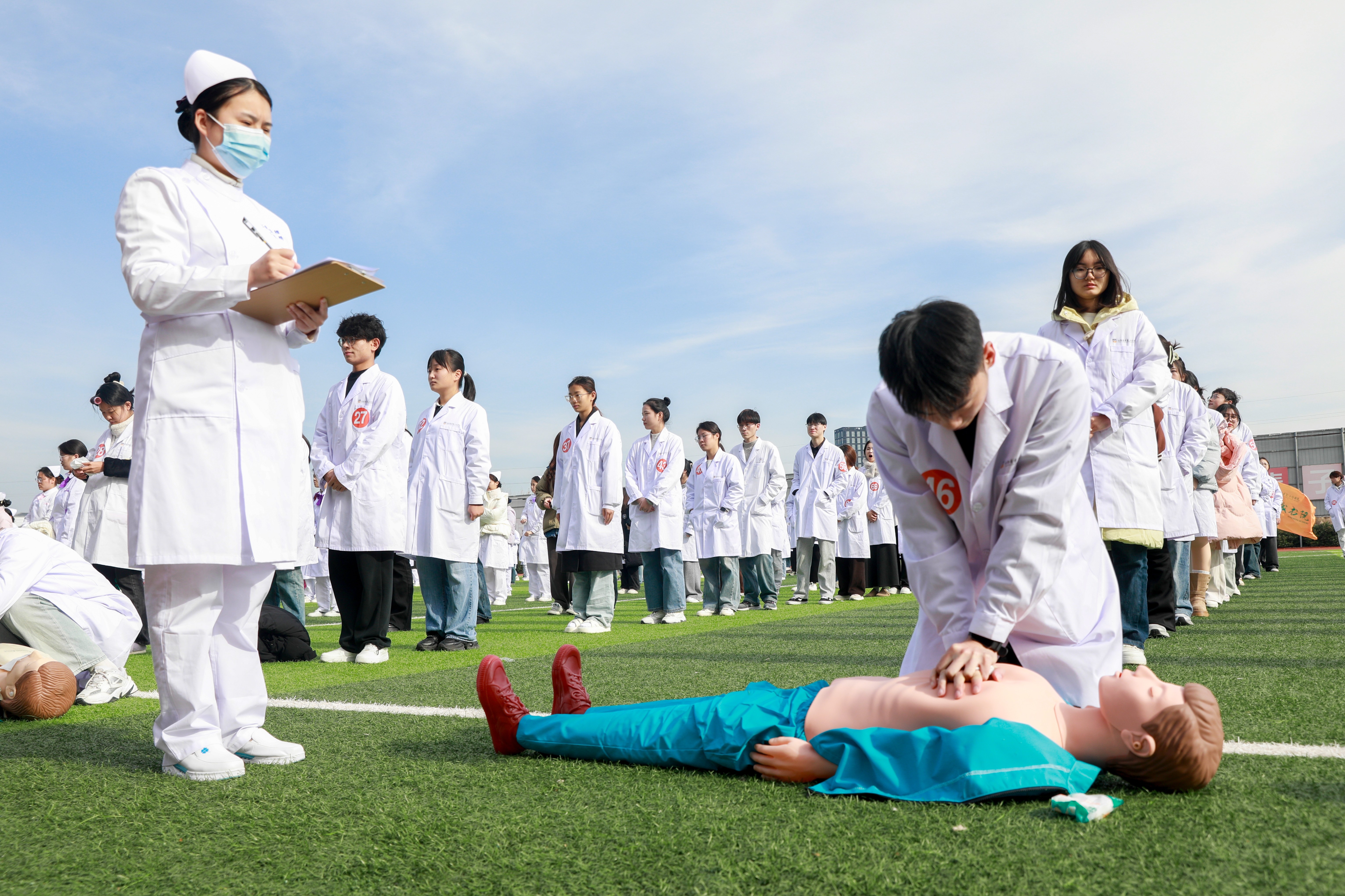 “周围环境安全,先生先生,你能听到我说话吗?1001、1002、1003、1004、1005、1006、1007、1008,患者呼吸消失,劲动脉搏动消失,胸廓起伏消失,这位穿红衣服的女士请您拨打120……”当日中午,随着主持人宣布活动开始,来自该校仁智书院、精诚书院等七个书院的1050名学生正式进入比赛状态。参赛学生以小组为单位进行比赛,他们从判断患者意识、呼叫救援,到进行胸外按压、人工呼吸,每一个步骤都严格按照标准执行,评委进行现场计时和打分。