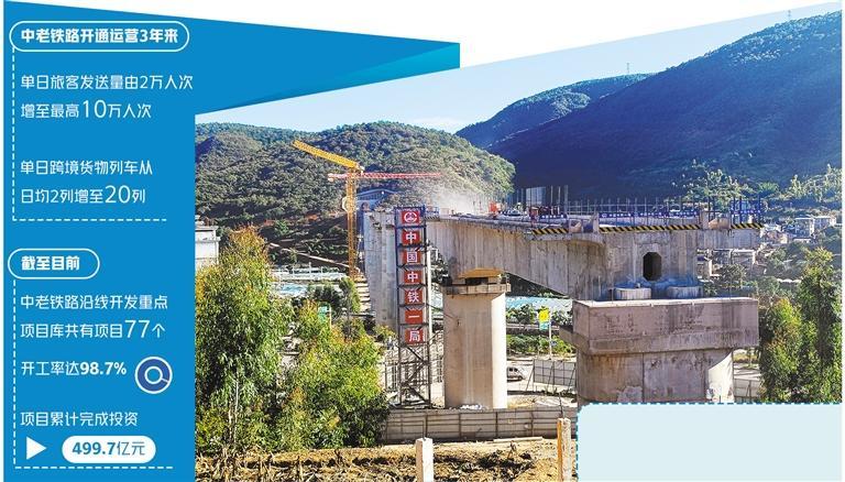 3年来,云南省抢抓中老铁路机遇,以通道能力提升、物流枢纽建设、沿线产业开发和经营主体培育为重点,切实打造一条开放发展的黄金道路。截至目前,中老铁路沿线开发重点项目库共有项目77个,开工率达98.7%,项目累计完成投资499.7亿元,投资完成率超66.7%,对促进中老铁路沿线开发发挥了重要作用。