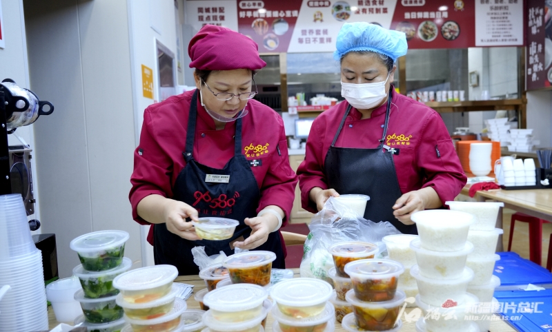 12月6日,乌鲁木齐市天山区解放北路街道养老服务中心,社区餐厅工作人员正在为老年人准备送上门的午餐。努尔艾力·图尔荪 摄