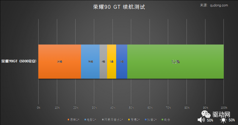 实测模拟日常体验,进行各一小时的网易云音乐、微博、抖音、B站电影、《原神》测试,五个小时的连续测试下,荣耀90 GT的电量从满电到结束仍还有52%。