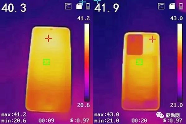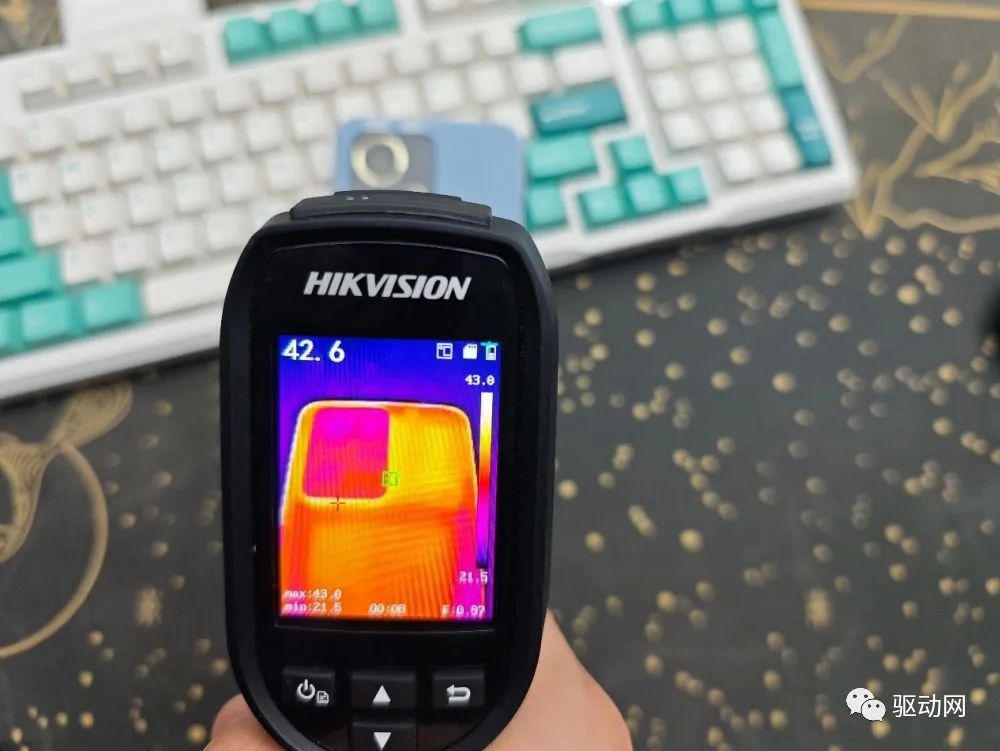在上述一小时的重载游戏测试后,我们也实测了荣耀90 GT的机身发热情况,机身的电池和主板区域的发热都压制的很不错,整机背面最高主板区域的温度控制在43℃左右,电池部分温度更低只有40摄氏度,机身背部基本保持在手感温热的合理区间,而正面屏幕的温度也控制较好在40摄氏度左右,长时间玩游戏不烫手。