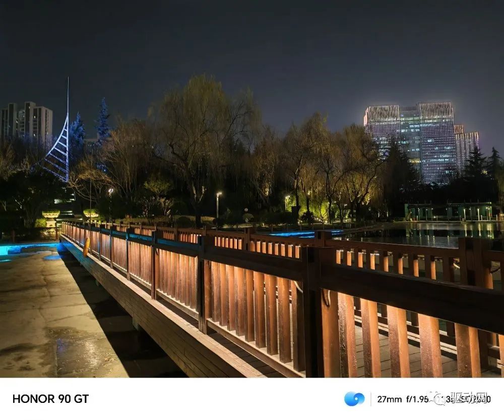 夜景模式下,夜晚成像更加清晰通透,公园中高光的浮桥,边缘暗光的树叶都能清晰的还原,夜景细节更加丰富,噪点更低层次更好。