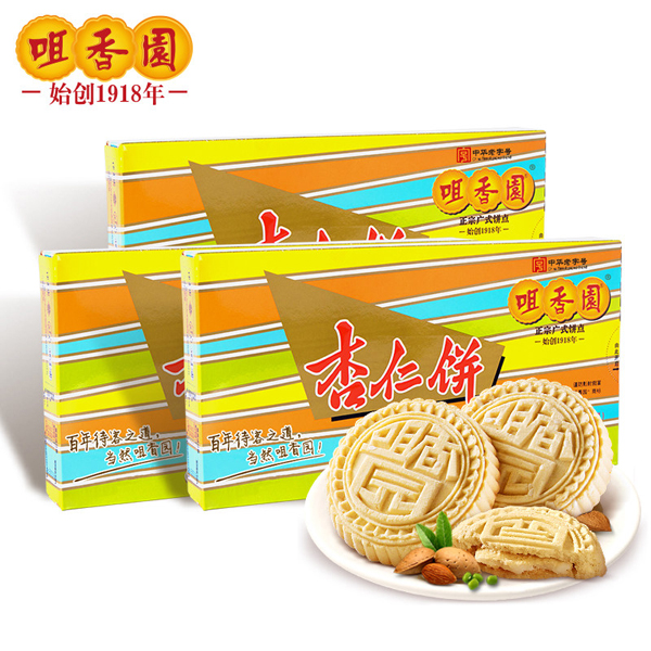 杏仁饼传统工艺是中山市非物质文化遗产、广东省非物质文化遗产,具有浓郁的中山地方特色,产品远销美国、澳大利亚、东南亚等国家以及香港、澳门地区,广东十大手信之一。咀香园杏仁饼创始于一九一八年,产于广东中山市,因其外形似杏仁而得名。已有八十余年历史,原属家庭自作自食,后创制成为产品,外形改为圆形小饼,饼身松脆,饼心香甜,入口松化,风味独特。