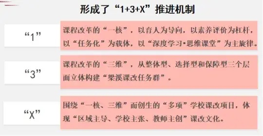 “X”指围绕“一核、三维”创生的“多项”具体课改项目。本着“自上而下”和“自下而上”相结合的原则,既鼓励学校积极参与区域整体型课改项目,又倡导学校结合实际创生校本项目。