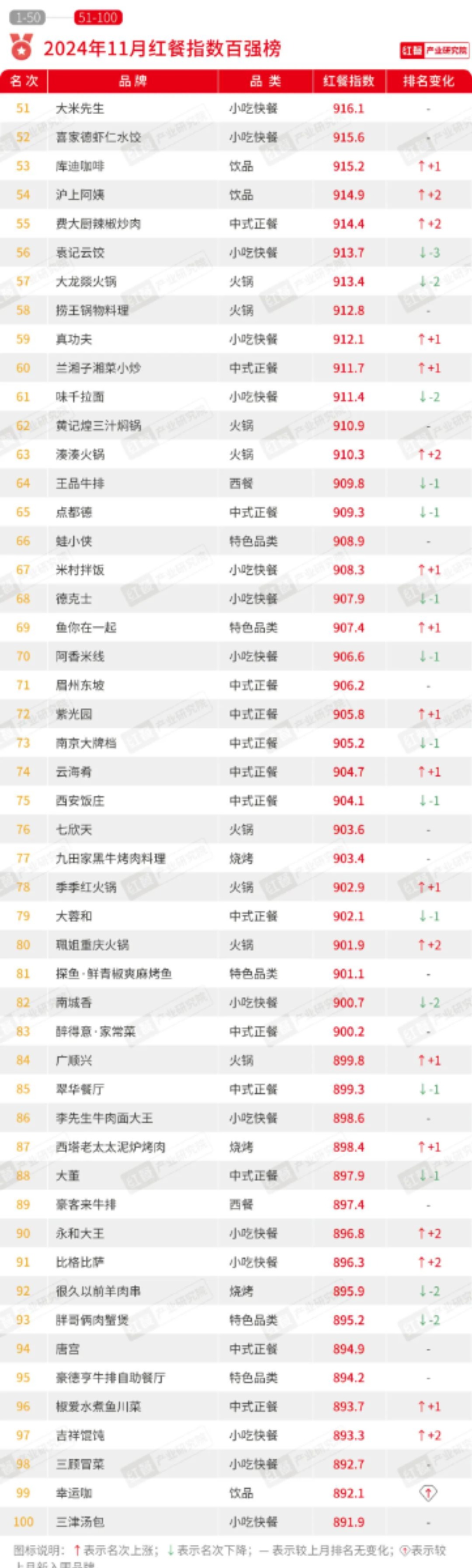 本报告了为你剖析2024年10月、11月餐饮行业景气指数以外,还会为你揭晓2024年11月红餐指数百强榜与2024年11月餐饮行业产品上新风向、品牌开店情况、融资上市新动态、餐企大动作以及行业大事件……