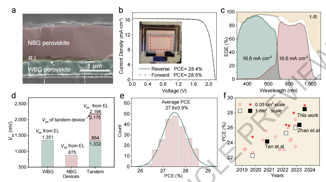 全钙钛矿叠层电池的扫描电镜图;b. 太阳能电池的电流-电压曲线;c. 太阳能电池的外量子效率与波长曲线;d. 不同带隙太阳能电池的开路电压曲线;e. 太阳能电池的功率转换效率图;f. 已发表的太阳能电池的功率转换效率图(图片来源:参考文献1)