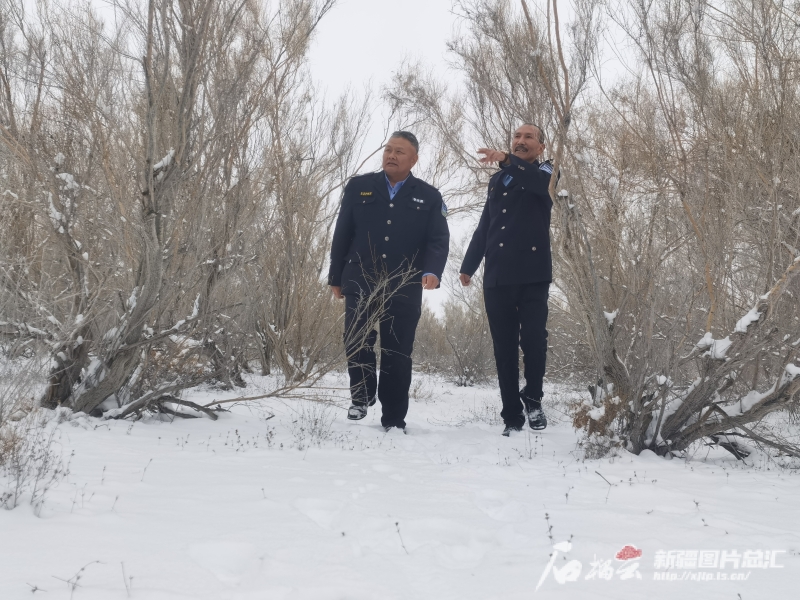 12月7日,阿不都克木里·阿司甫(右)和同事李代勇(左)在步行巡护。 石榴云/新疆日报记者 白素君摄
