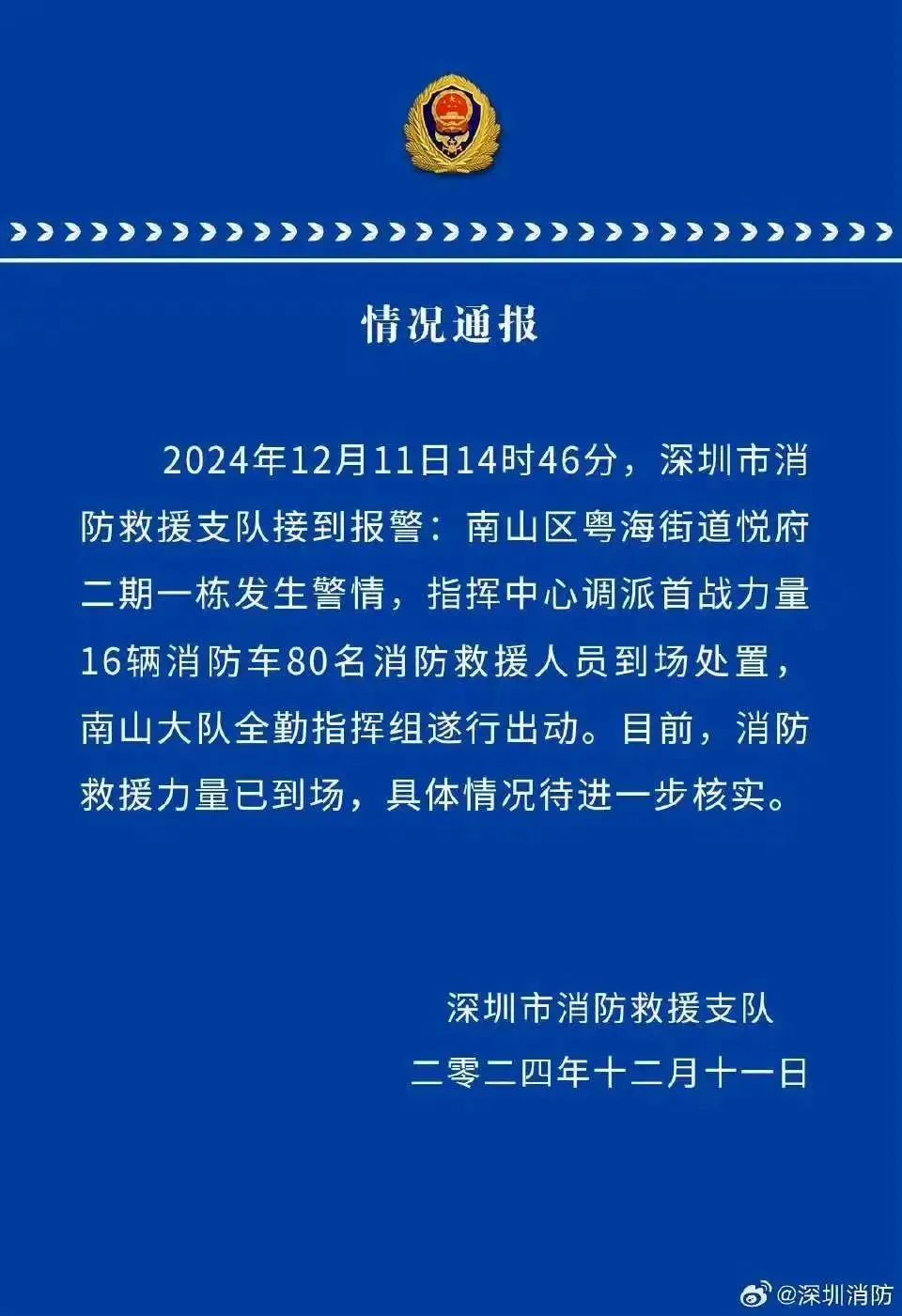 15时59分,深圳消防发布通报——12月11日14时46分,深圳市消防救援支队接到报警:南山区粤海街道悦府二期一栋发生警情,指挥中心调派首战力量16辆消防车80名消防救援人员到场处置,南山大队全勤指挥组遂行出动。目前,消防救援力量已到场,具体情况待进一步核实。