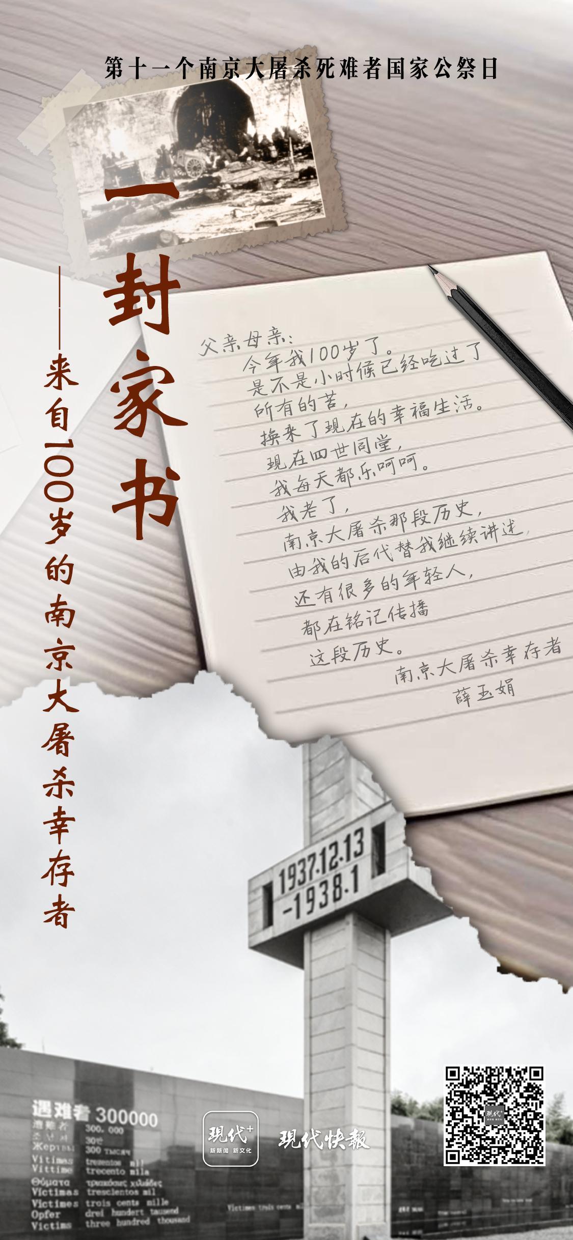 第十一个南京大屠杀死难者国家公祭日即将到来,今年100岁的南京大屠杀幸存者薛玉娟,写了一封家书给逝去的亲人。