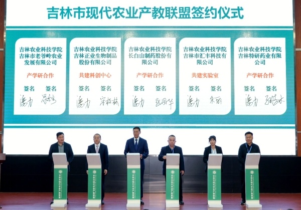 会上,吉林农业科技学院分别与吉林市老爷岭农业发展有限公司、长白山制药股份有限公司、吉林市汇丰科技有限公司、吉林正业生物制品股份有限公司、吉林特研药业有限公司签署校企合作协议。