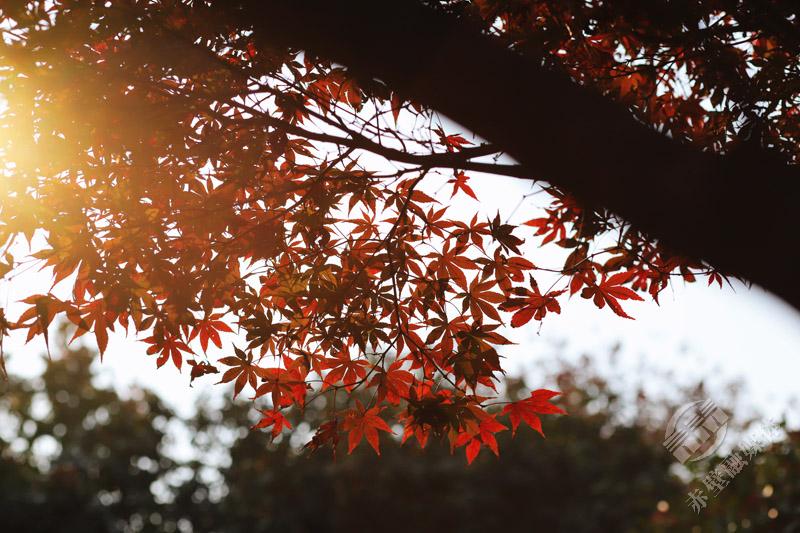 一片片红枫在冬日阳光的照耀下