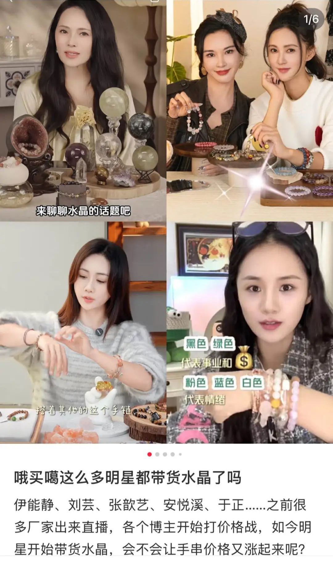 除了伊能静,张歆艺、董洁、张俪等明星也常在自己的小红书直播间带货水晶。此外在抖音上,于正也加入了“水晶带货大军”。