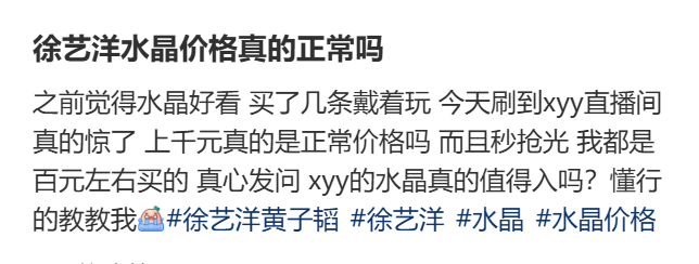多名网友发帖吐槽徐艺洋售卖的水晶太贵,直播的目的就是为了带货。