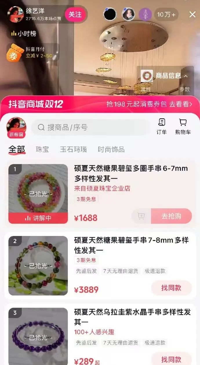 12月10日,女星徐艺洋开启直播卖水晶手串。商品链接显示,徐艺洋售卖的水晶手串售价在几十到几千元不等,多款商品显示已售罄。