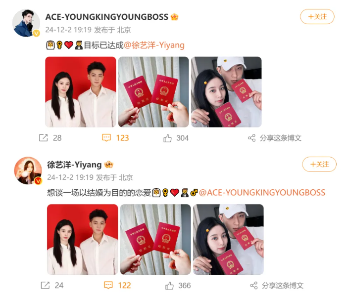 12月2日晚,黄子韬、徐艺洋晒出结婚证,官宣结婚喜讯。