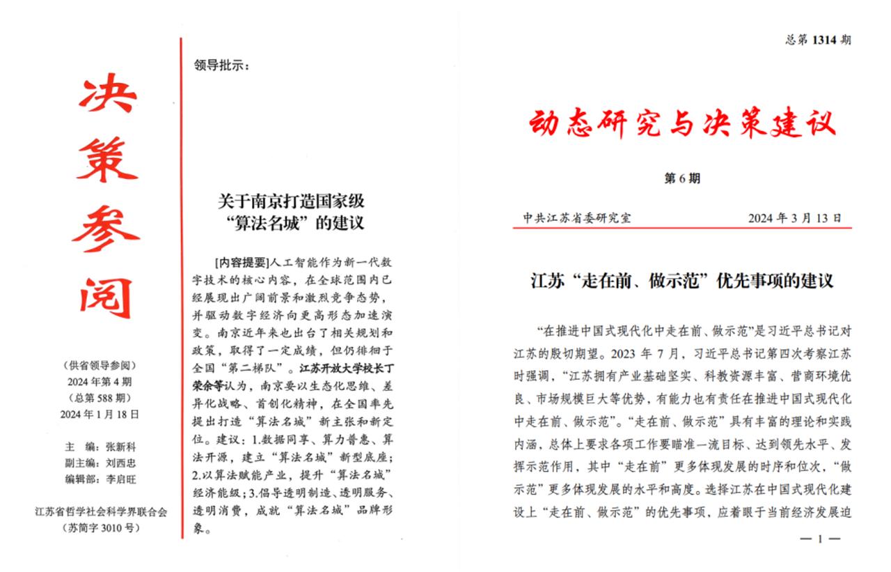 在应用研究方面,研究院成功中标中移(苏州)软件技术有限公司、南京市委研究室、盐城市委研究室、鼓楼区市场监督管理局等多个委托课题,为区域经济和产业发展提供了大量智力支持和战略参考。聚焦江苏发展实际,研究团队撰写了多篇决策咨询报告,《江苏发展人工智能大模型产业的路径建议》等获得省级领导肯定性批示,其中《关于南京打造国家级“算法名城”的建议》荣获“2024年度江苏省科技智库精品成果”称号,充分发挥了研究院在推动江苏省产业转型和创新发展中的前沿作用。