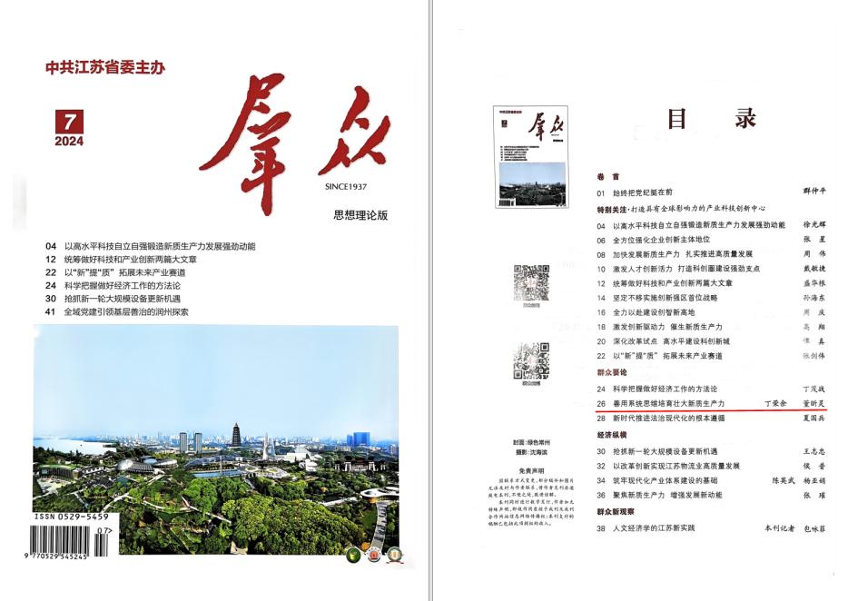理论研究方面,研究院承担了江苏省发展和改革委员会“十五五”规划前期研究经济社会高质量发展总体思路研究和江苏深化经济体制改革思路举措研究两项重大课题并顺利结项。成功立项2024年度省社科重大应用研究课题、2024年度省基础研究专项资金(软科学研究)重点项目、2024年度江苏省教育科学规划战略性与政策性重大招标课题以及中共江苏省委研究室重点课题等,进一步强化了与地方政府和各大科研机构的合作关系。研究团队围绕新质生产力的内涵与发展路径,在《群众》《新华日报》上发表两篇理论文章,深入探讨创新驱动发展的内在逻辑与关键要素,推动了区域创新生态理论的创新与突破。