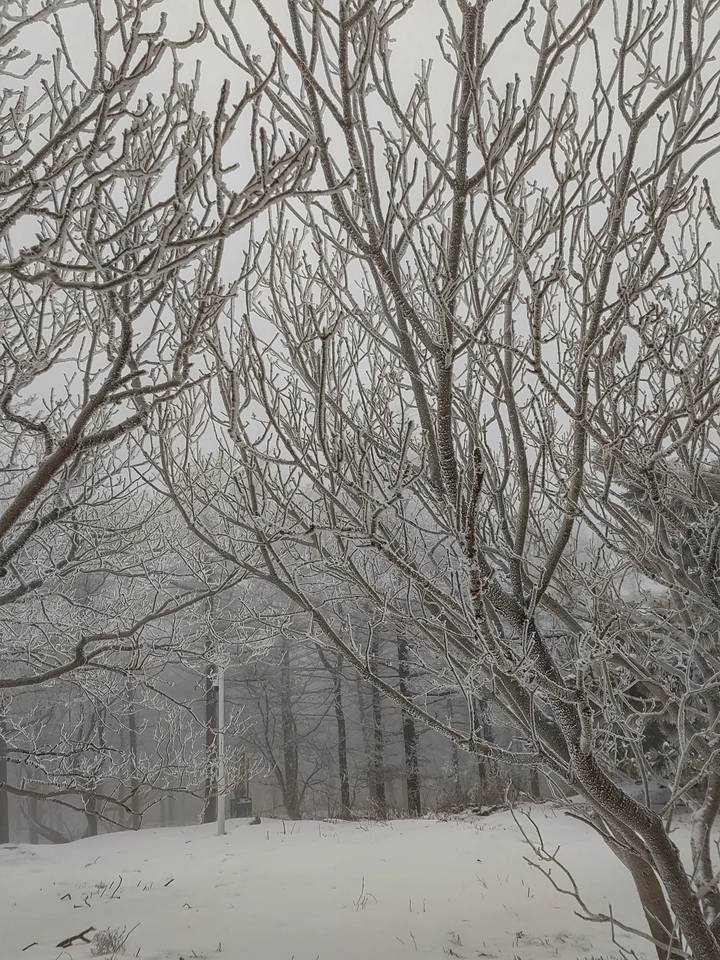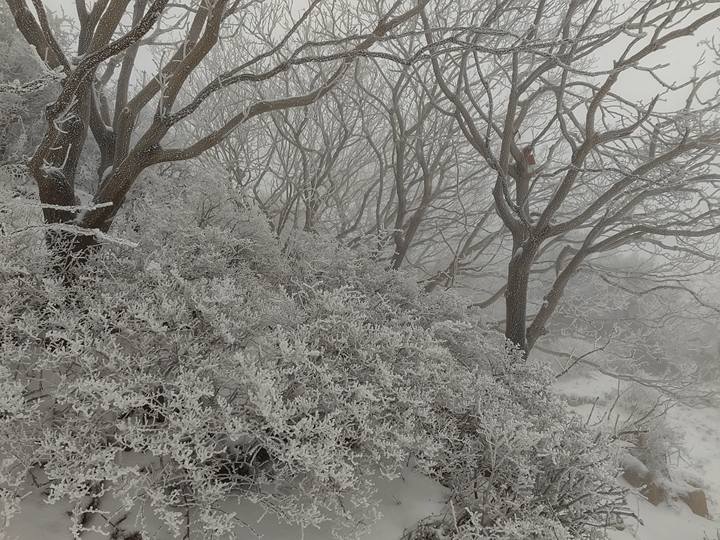 洁白的冰晶和雪花层层包裹着树枝,每一根枝丫都被大自然精心雕琢成珊瑚的模样,它们或蜿蜒伸展,或簇簇拥拥,纤细处如珊瑚的触角,精巧灵动;粗壮些的仿若珊瑚的主干,刚劲而又不失柔美。草木疏密有致地排列着,在凛冽的寒风中,静止成一幅绝美的冬日盛景。