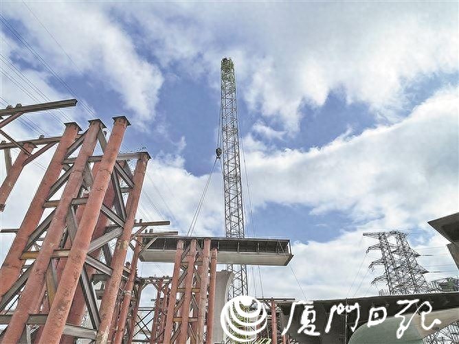 近日,由厦门路桥工程公司代建、中建五局承建的同翔大道洪溪互通工程主线桥第六联钢箱梁首节成功吊装。