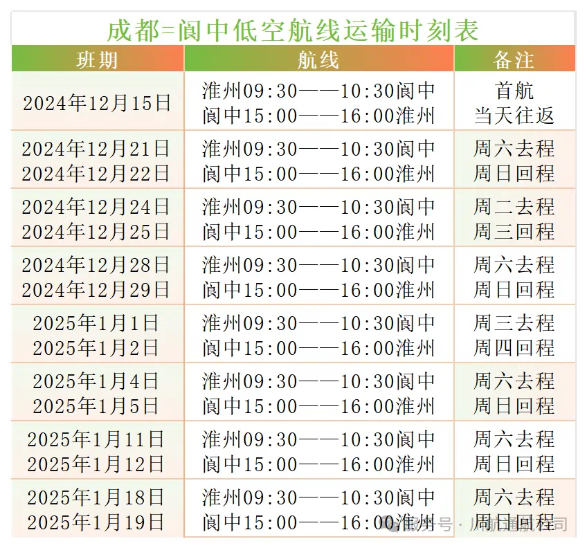 据悉,今年内,该航线总运行班次预计5-8个往返;2025年,计划每天1班常态化飞行。根据运输时刻安排,运营前期,从成都淮州飞往阆中古城,起飞时间多安排在周六,回程则在周日。其中,去程计划于上午9时30分起飞,10时30分飞抵阆中机场;返程计划于下午3时从阆中机场起飞,下午4时回到成都淮州机场。