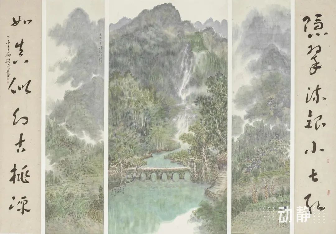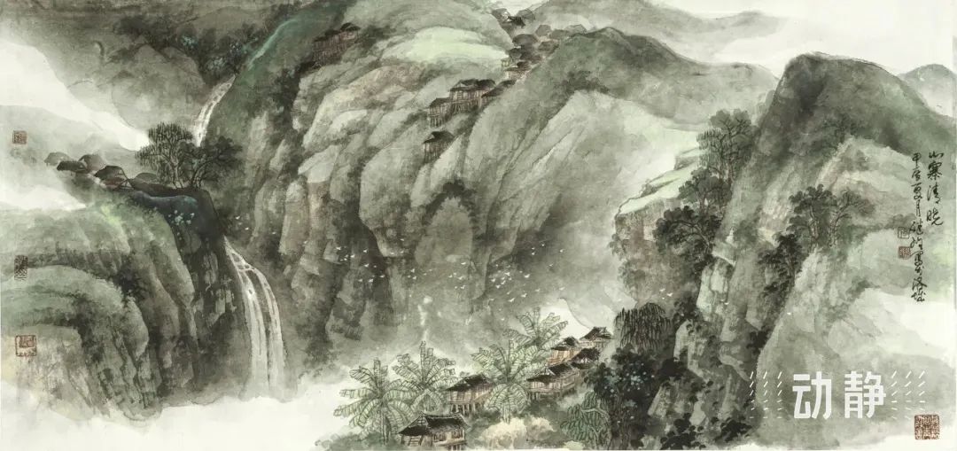 劳继雄的山水画则以绿色为生命的象征,基调清新淡雅。1950年生于上海的他,凭借对宋代山水画的深入研习和油画功底的加持,为中国画注入了新的活力。他的作品《山寨清晓》和《云雾山中》打破了中国画平面表现的局限,层叠的山峦光影交错,山形与云形相互呼应,观者仿佛能在这有限的画面中感受到高山大河的绵延壮阔,陷入一种如梦似幻的情境之中,深刻领略到贵州山水的博大与深邃。