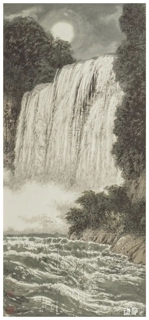 冯大中的作品同样令人瞩目。这位生于1949年辽宁的艺术大家,以画虎成名,而他的山水画作也别具一格。他创作的 “冰裂纹皴法” 让其画风严肃典雅又充满浪漫情怀。在《黄果树瀑布》这幅作品中,他将黄果树瀑布的壮丽雄浑展现得淋漓尽致。那磅礴的气势如万马奔腾,而留白之处的波光粼粼,又似阳光在水面上跳跃的精灵,赋予了画面鲜活的生命力,让人不禁感叹大自然的鬼斧神工与艺术家的精湛技艺。