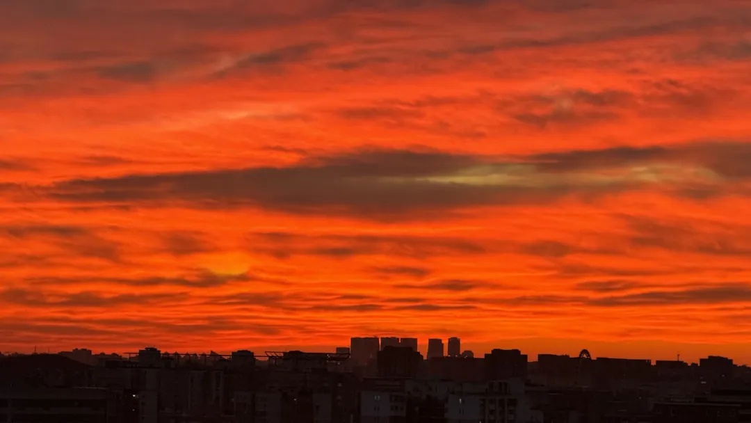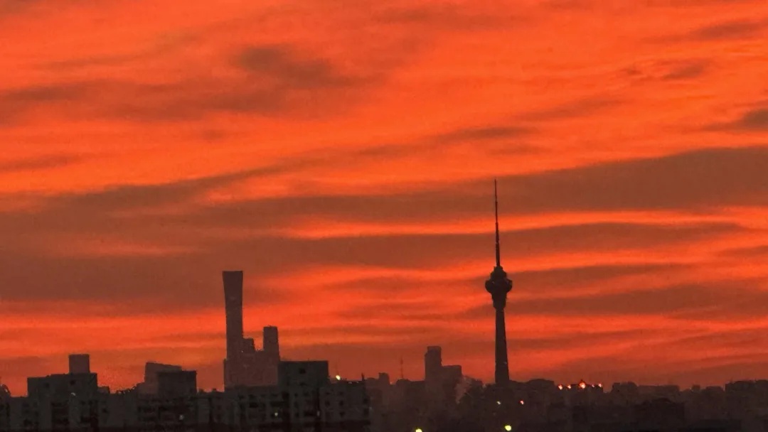 12月16日晨,北京的天空出现似火朝霞,将沉寂的夜空与即将苏醒的城市温柔地连接起来。