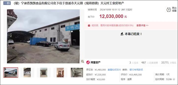 据悉,今年10月19日,宁波香飘飘食品有限公司名下位于慈溪市天元镇(现周巷镇)天元村工业房地产被破产拍卖成交,成交价为 1203万元。
