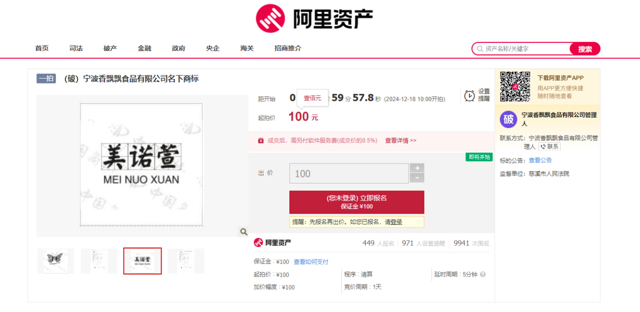 公开信息显示,宁波香飘飘食品有限公司名下2个注册商标“香优美”“美诺萱”将被破产拍卖,起拍价仅为100元,保证金为100元,起拍时间为12月18日10:00。截至12月16日14时,已有9943次围观,449人报名准备竞拍。