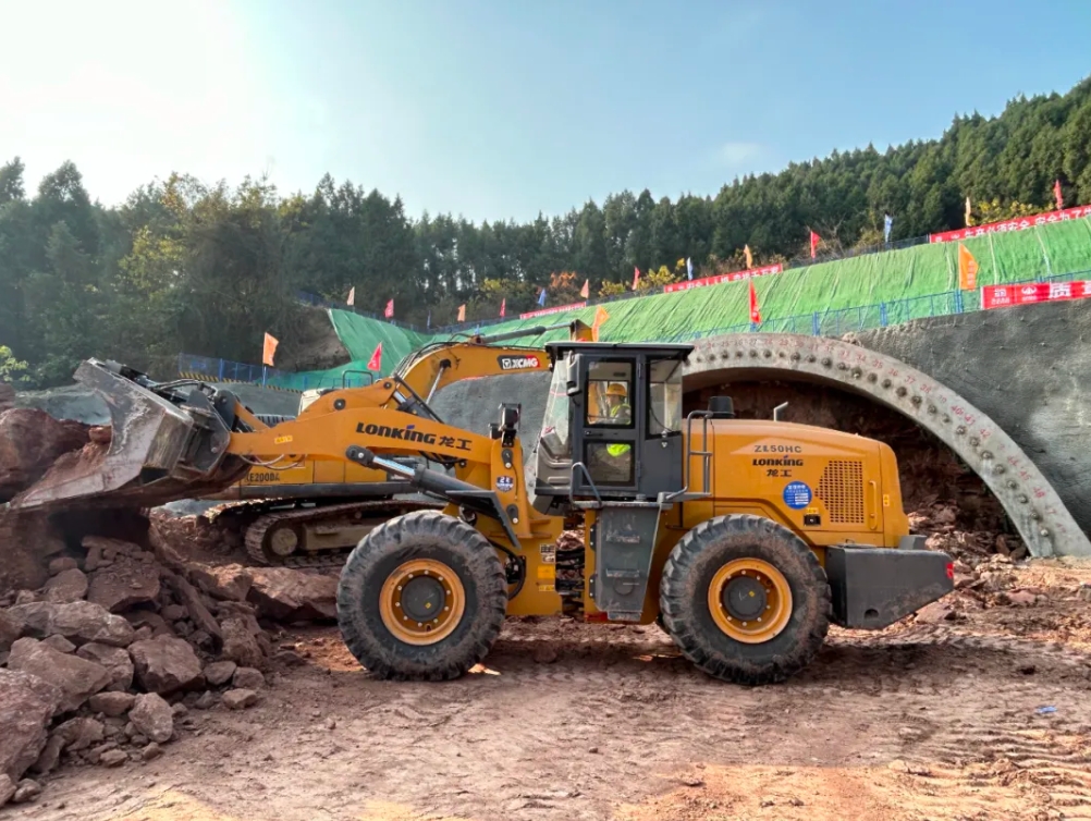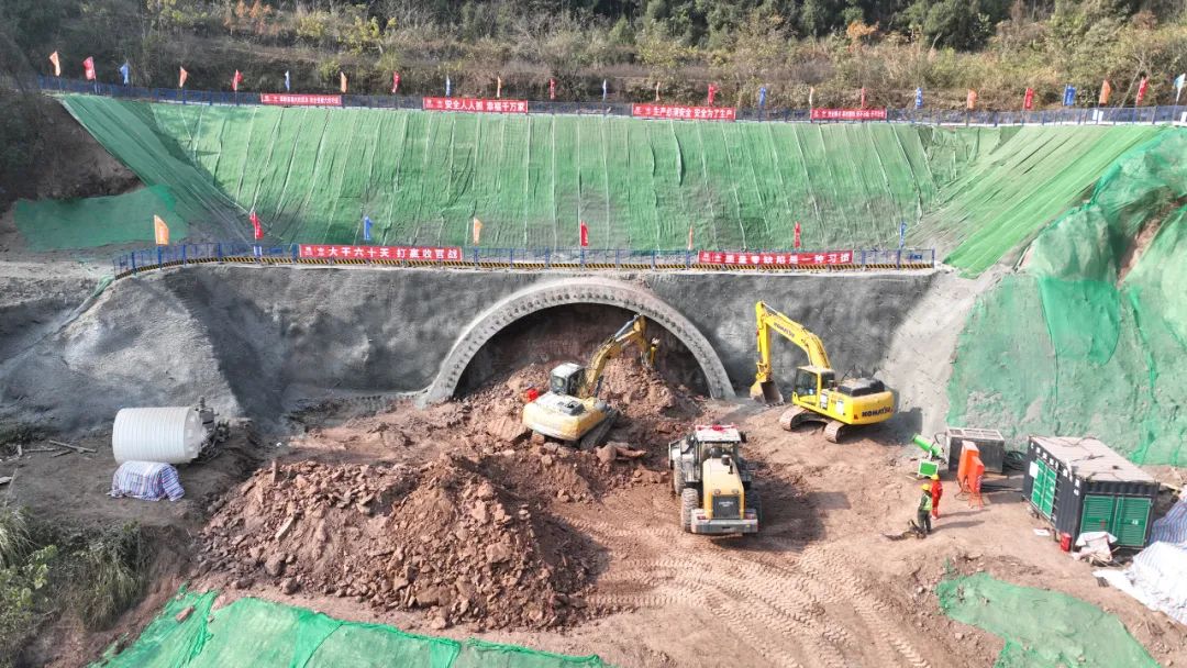12月16日,在挖掘机的阵阵轰鸣声中,绵遂内铁路射洪段金家隧道出口正式进入了主洞施工阶段。施工现场一片繁忙景象,工程车辆往来穿梭,挖掘机在洞口紧张作业,机械臂铿锵有力地挥动着,将坚硬的岩石一点点凿开、装载并外运。