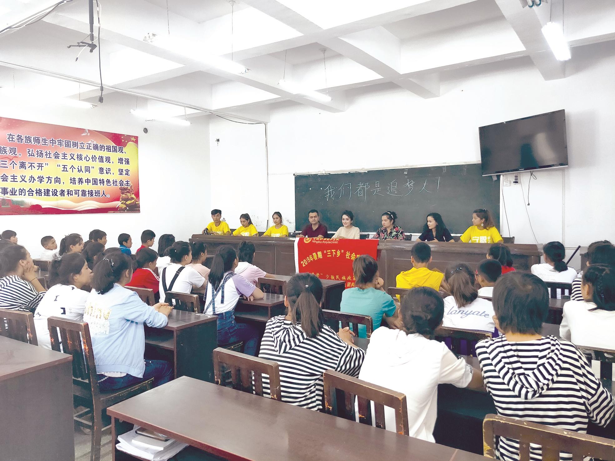 “幸福石榴籽宣讲队”赴新疆喀什也克先拜巴扎初级中学宣讲(讲台左五是米娜瓦尔·艾力)。