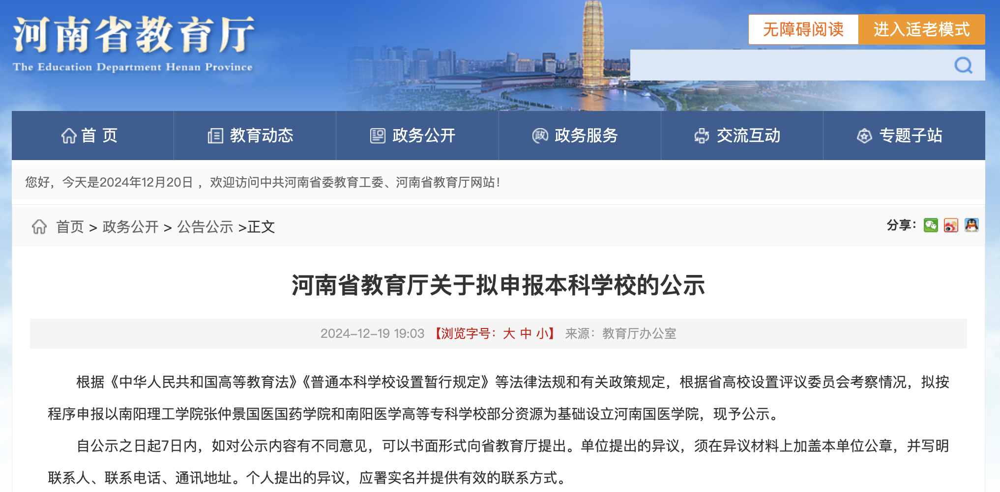 12月19日,河南省教育厅公示拟申报本科学校。根据《中华人民共和国高等教育法》《普通本科学校设置暂行规定》等法律法规和有关政策规定,根据省高校设置评议委员会考察情况,拟按程序申报以南阳理工学院张仲景国医国药学院和南阳医学高等专科学校部分资源为基础设立河南国医学院。
