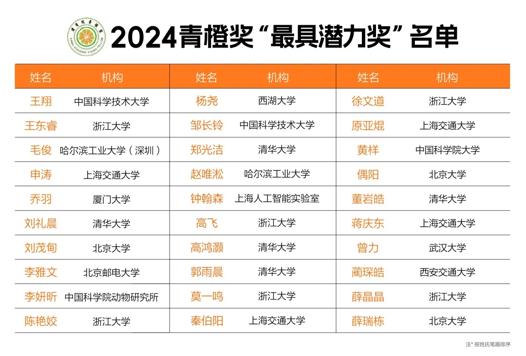 此外,青橙奖今天还公布了“最具潜力奖”的30人名单,每位青橙奖“最具潜力奖”获得者将获得10万(税前)可自由支配的奖金。30位获奖人中,6位来自浙江大学,5位来自清华大学,3位来自北京大学,3位来自上海交通大学。以下是具体名单: