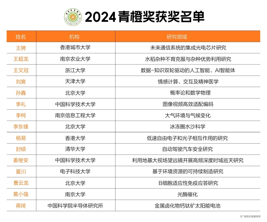 2024年青橙奖获奖名单显示,15名中国青年科学家获奖,每位青橙奖获得者将获得100万(税前)可自由支配的奖金。15位获奖者中,有3位来自北京大学,2位来自中国科学技术大学。