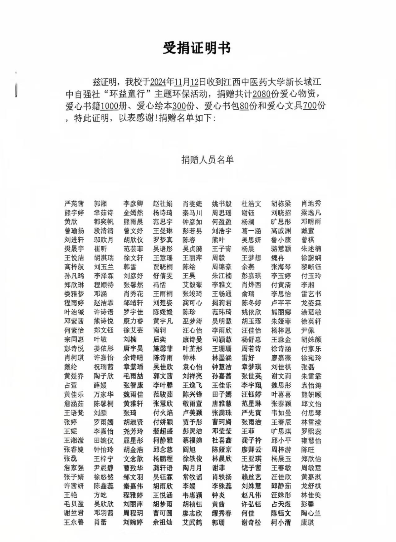 为了关爱和鼓励留守儿童,促进他们积极健康成长,10月26日至11月3日,江西中医药大学自强社携手“环益童行”项目组共同举办“青年汇爱,益童前行”公益主题活动,近1700名学子参与,本次活动的意义在于,为留守儿童点亮求学之径,让他们切实感受到社会的深切关爱;为孩子们营造更为优良的成长环境,使他们在知识的充分滋养下茁壮成长,能够坚定且勇敢地去追逐自己的梦想。