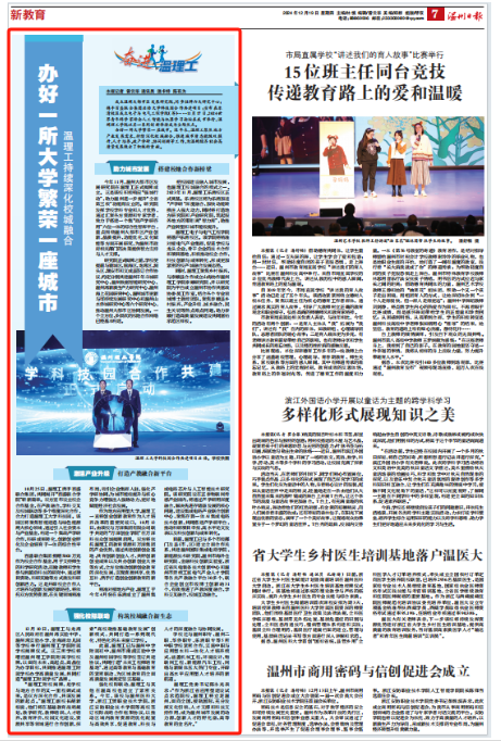 办好一所大学繁荣一座城市。近年来,温理工聚焦地方产业发展需求,持续深化校城融合,推进城市质态能级双提升、人才培养、政产学研、协同创新等工作,为温州经济社会高质量发展做出了积极的贡献。
