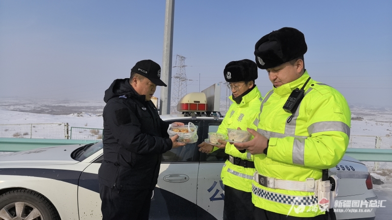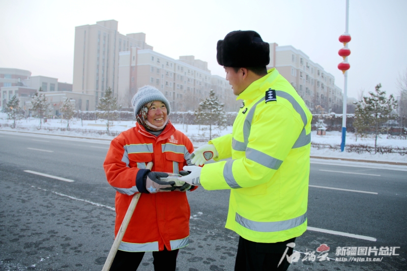12月18日,沙湾市公安局交警大队民警将热气腾腾的饺子送到环卫工人手中。刘畅畅 摄