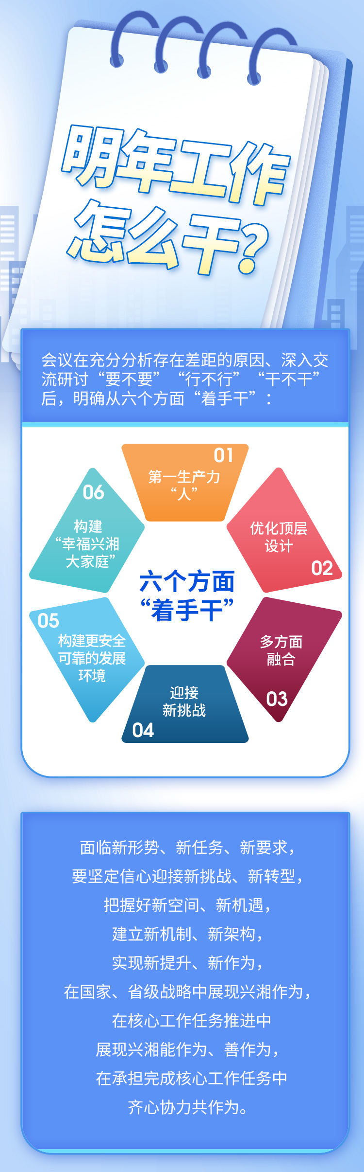 明年工作怎么干?会议在充分分析存在差距的原因、深入交流研讨“要不要”“行不行”“干不干”后,初步明确从第一生产力“人”、优化顶层设计、多方面融合、迎接新挑战、构建更安全可靠的发展环境、构建“幸福兴湘大家庭”等六个方面“着手干”,努力圆满完成三个基本目标。面临新形势、新任务、新要求,要坚定信心迎接新挑战、新转型,把握好新空间、新机遇,建立新机制、新架构,实现新提升、新作为,在国家、省级战略中展现兴湘作为,在核心工作任务推进中展现兴湘能作为、善作为,在承担完成核心工作任务中齐心协力共作为。