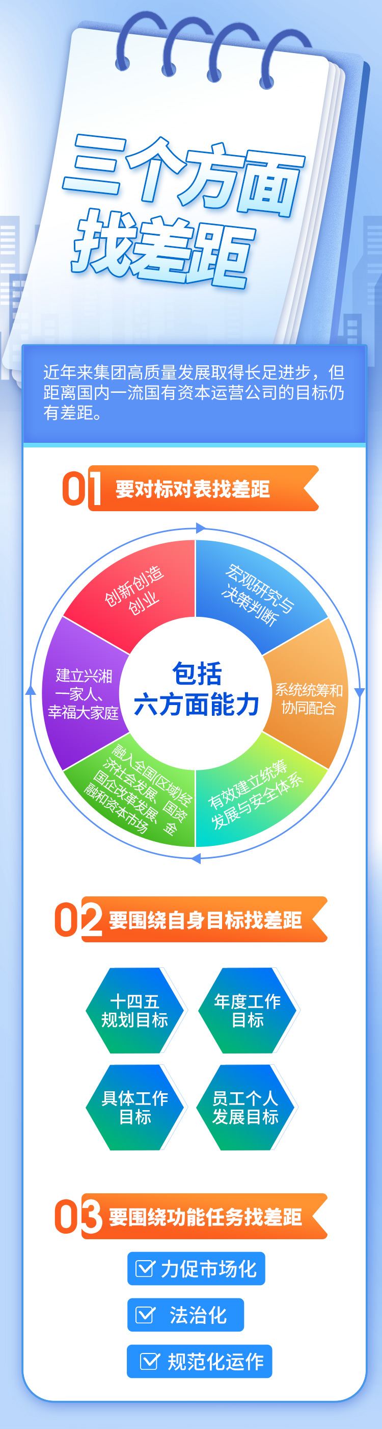 贺柳指出,近年来集团高质量发展取得长足进步,但距离国内一流国有资本运营公司的目标仍有差距。要对标对表找差距,包括创新创造创业、宏观研究与决策判断、系统统筹和协同配合、有效建立统筹发展与安全体系,融入全国(区域)经济社会发展、国资国企改革发展、金融和资本市场,建立兴湘一家人、幸福大家庭等六方面能力;要围绕自身目标找差距,包括“十四五”规划目标、年度工作目标、具体工作目标、员工个人发展目标等;要围绕功能任务找差距,更好实现功能性任务市场化、法治化、规范化运作。