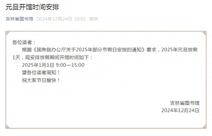 2024年12月24日,吉林省图书馆发布《元旦开馆时间安排》。