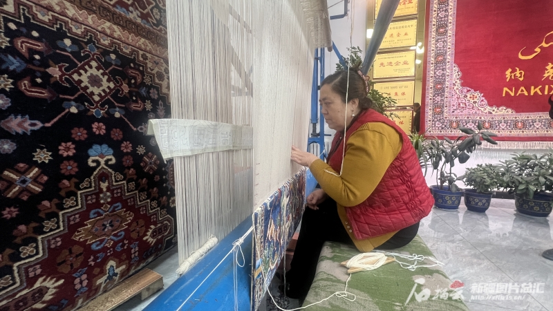 12月22日,在新疆纳克西湾手工地毯开发有限公司,工作人员在编织地毯。石榴云/新疆日报记者 拍热扎提·阿不都摄