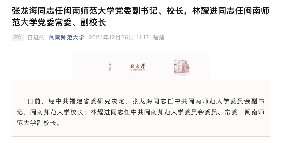 据闽南师范大学消息,日前,经中共福建省委研究决定,张龙海同志任中共闽南师范大学委员会副书记,闽南师范大学校长;林耀进同志任中共闽南师范大学委员会委员、常委,闽南师范大学副校长。