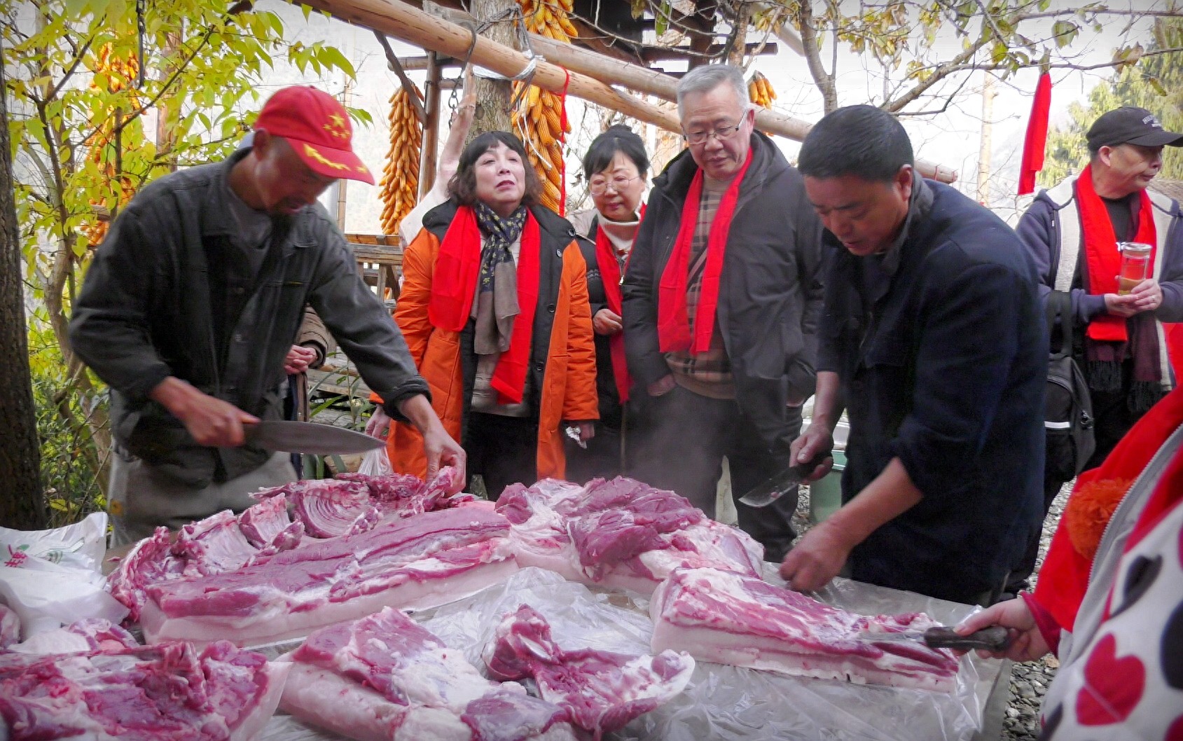 庖汤宴上,当然也少不了采购“年货”带回家和亲朋好友一起享用。当地新鲜宰杀的土猪肉和排骨、香肠、猪脚等腊肉制品引发了游客们的抢购热潮。“这些粮食猪肉都是正宗的,玉米和野菜喂养大的,今天我们买了五百多块钱的猪排、猪肉。”游客朱莉莉说。