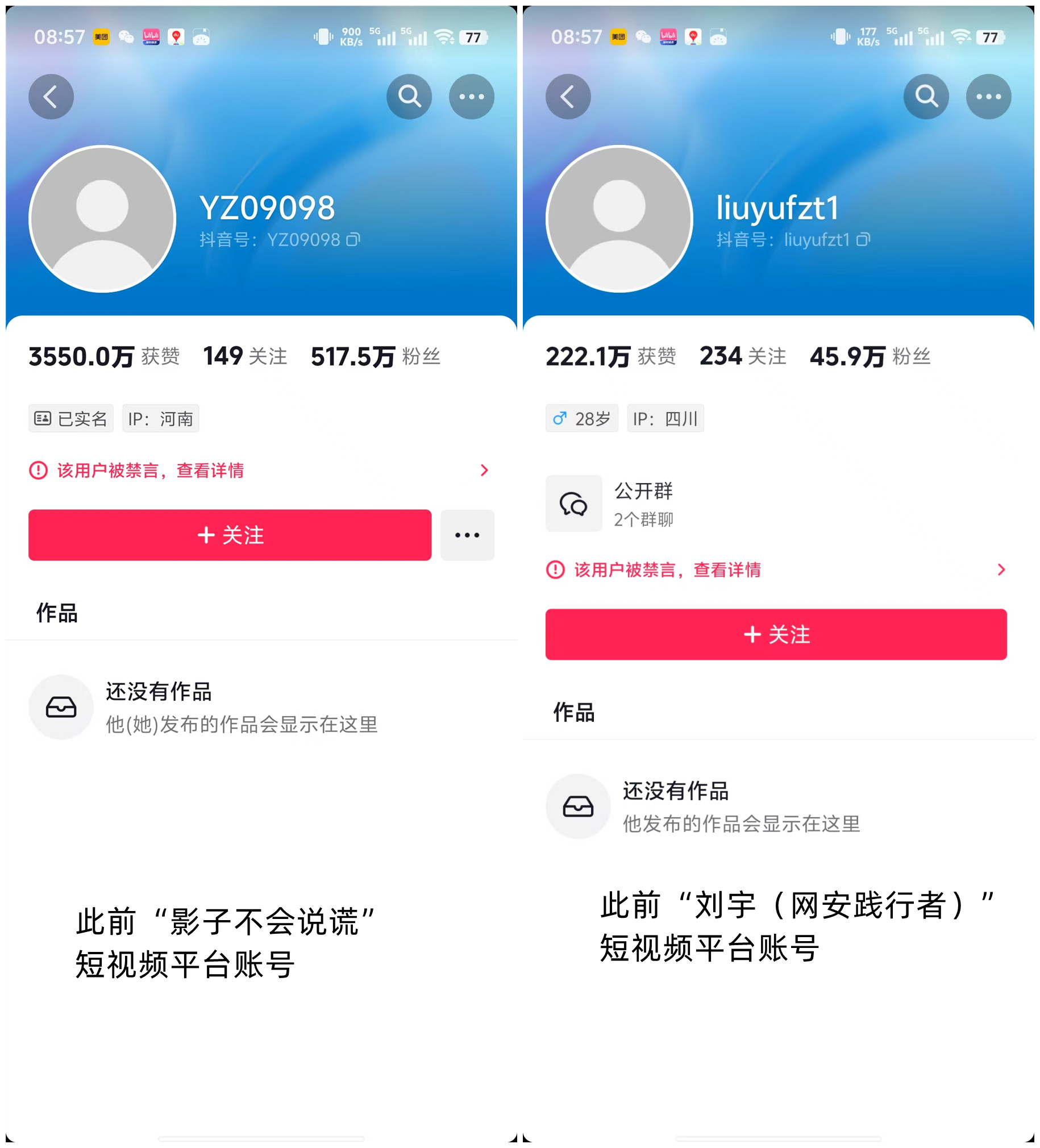 12月28日上午,记者发现此前曾曝光多起偷拍摄像头的短视频博主“影子不会说谎”、“刘宇(网安践行者)”的抖音账号已被平台禁言。