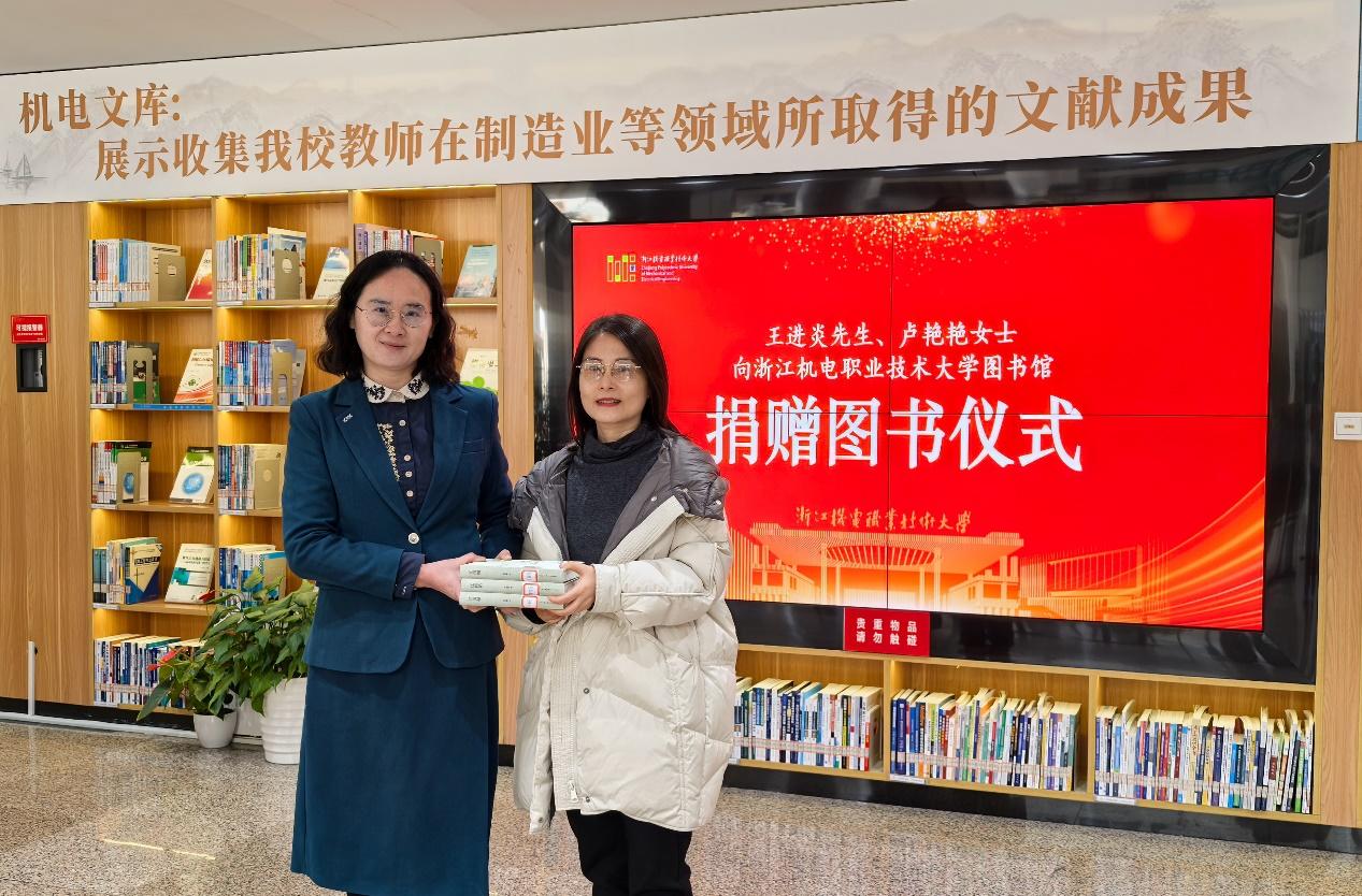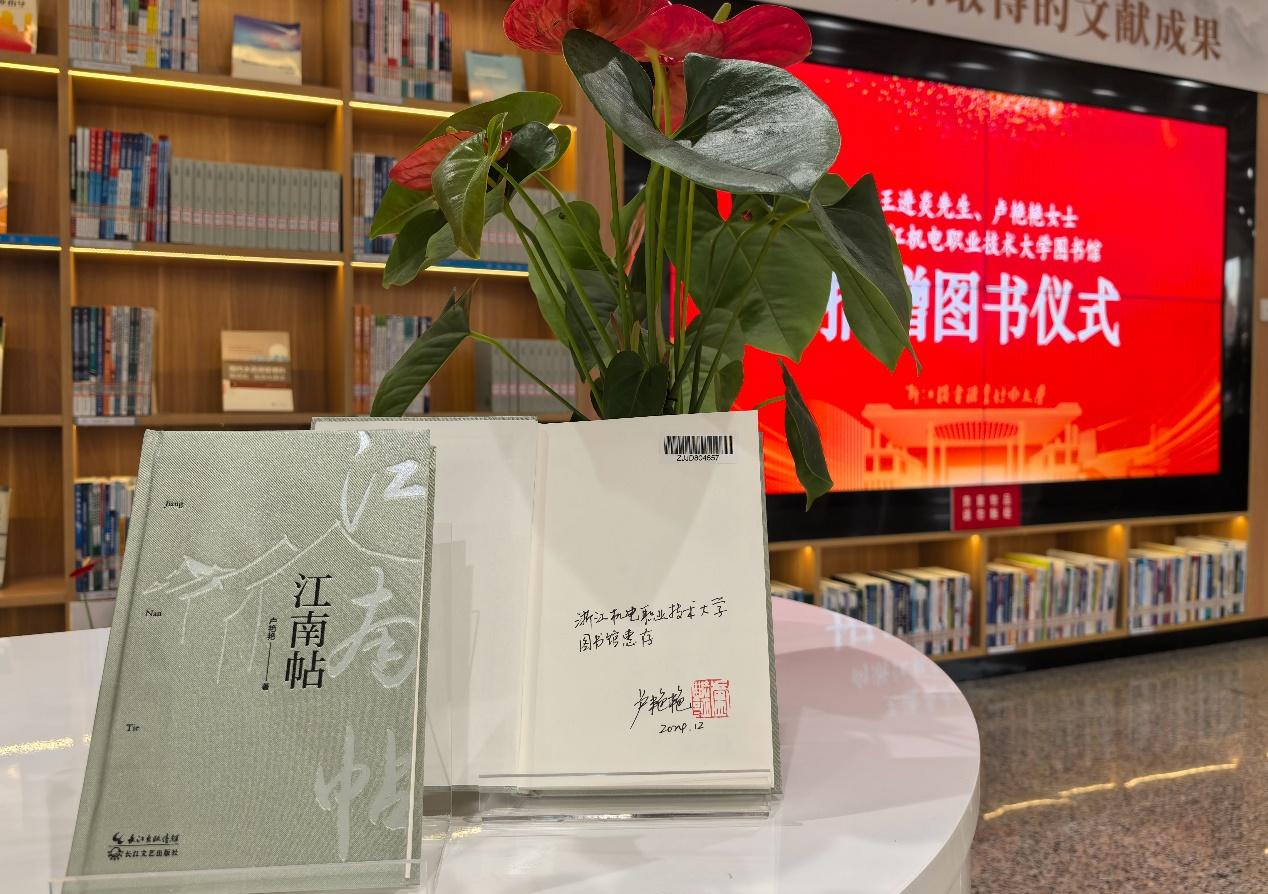 卢艳艳老师还带来著作《江南帖》,该书由爱心人士王进炎先生购买并捐赠给浙机电大。图书馆馆长周秀梅对王进炎、卢艳艳的捐赠表示诚挚感谢,并为其颁发图书捐赠证书。