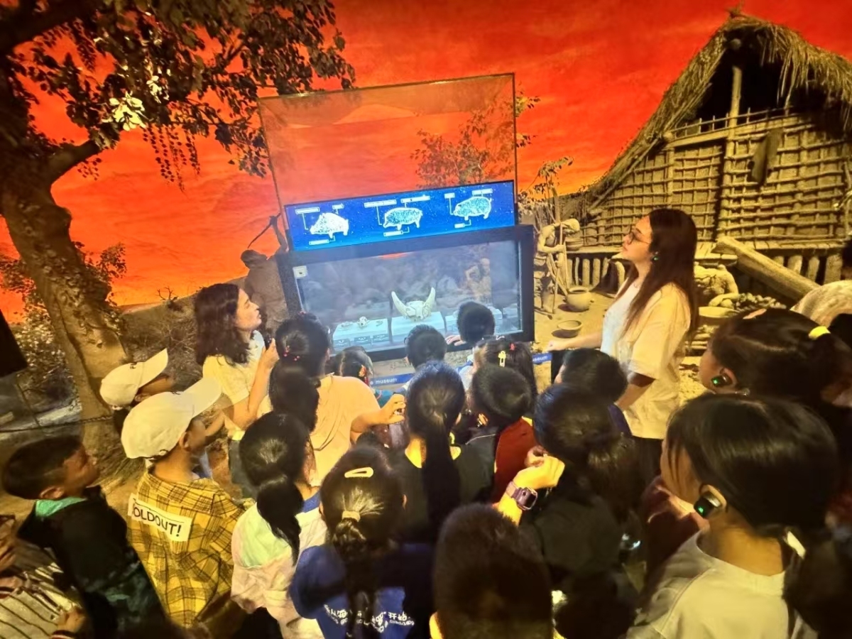 志愿者带领孩子们参观河姆渡遗址