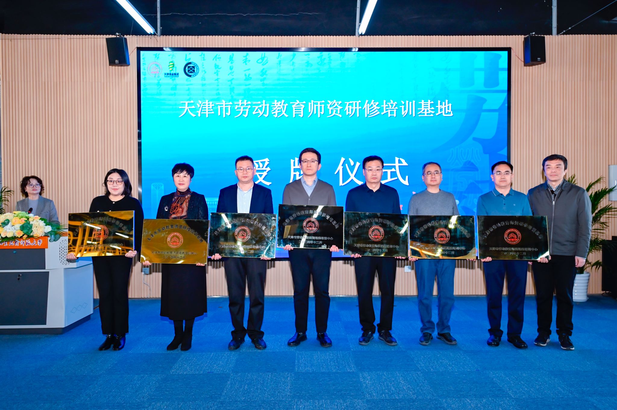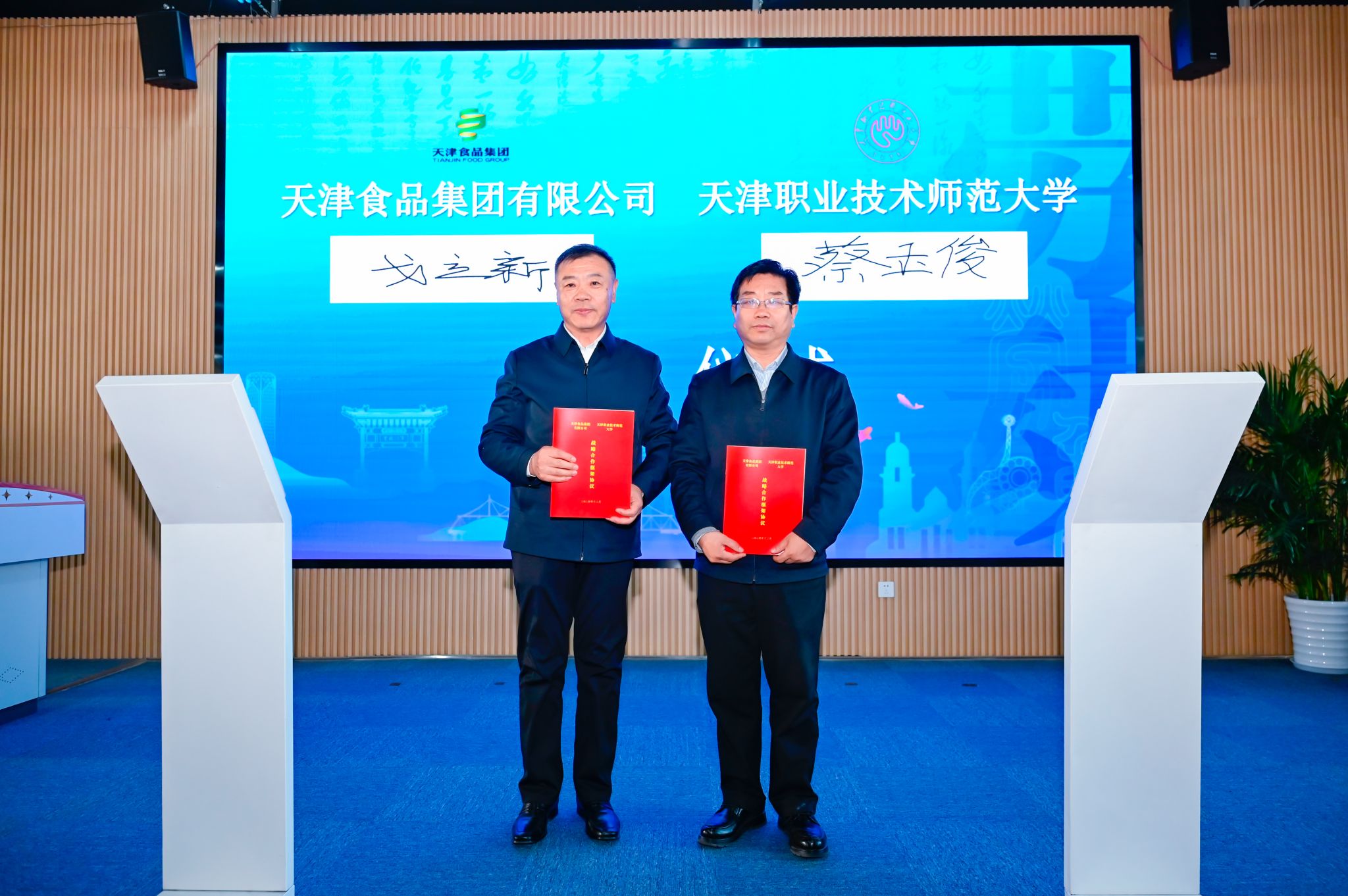 蔡玉俊与戈立新分别代表双方签署战略合作协议。张健青为天津农垦渤海农业集团有限公司、天津利达粮油有限公司、天津海河乳品有限公司、天津二商迎宾肉类食品有限公司、天津市利民调料有限公司、天津市经济贸易学校,以及河西区文化馆七家单位颁授“天津市劳动教育师资研修基地”牌匾。旨在充分发挥校企各自优势资源,共同打造具有天津特色的校企合作、本土企业劳动文化与学校劳动教育相融合的天津模式。