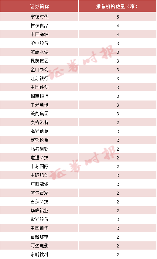 据Wind数据,截至1月1日,已有143只股票获券商机构推荐,其中,宁德时代获5家券商机构推荐,甘源食品、中国海油获4家券商机构推荐,沪电股份、海螺水泥、江苏银行、中兴通讯等多只股票获3家券商机构推荐。