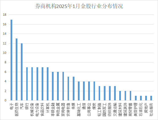 据Wind数据,截至1月1日,招商证券、中泰证券、平安证券等多家券商机构2025年1月推荐的“金股”达143只,覆盖电子、医药生物、汽车、银行等多个行业板块。其中,电子行业覆盖的股票数量最多,也是机构看好的方向之一。