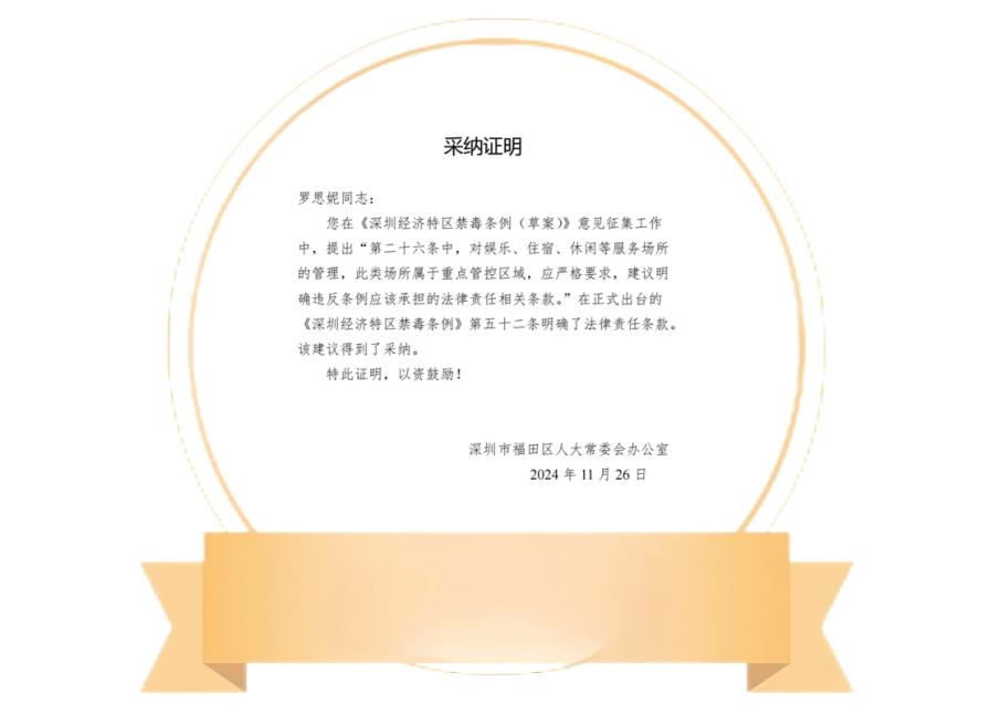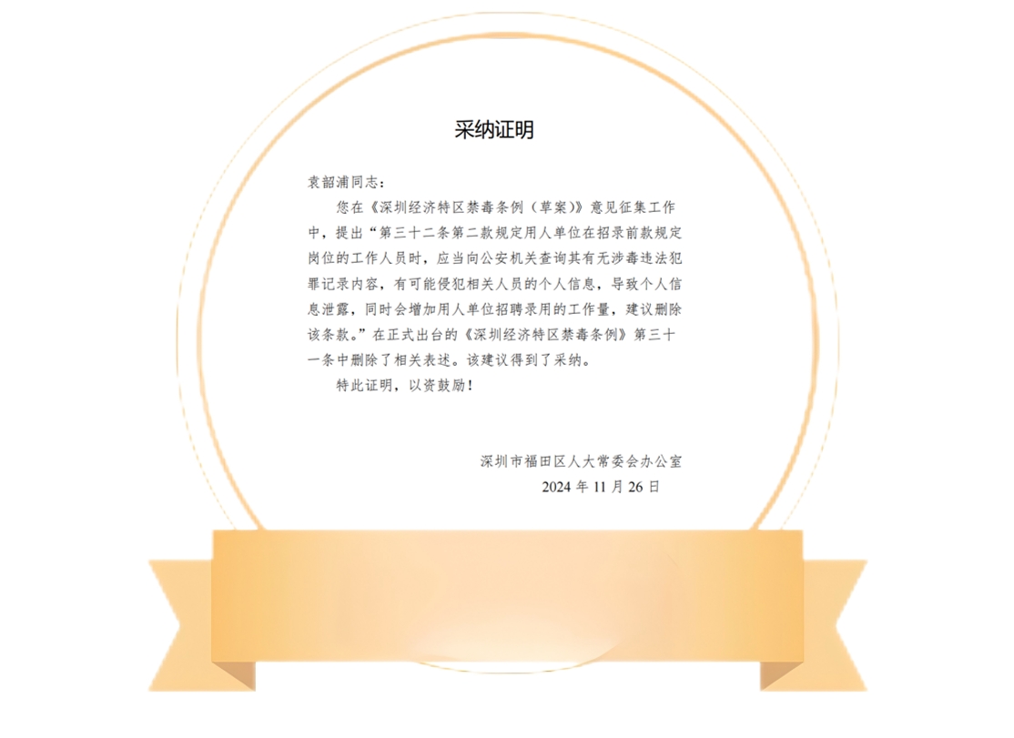 与此同时,河套立法联系点立法议事会成员、华商希仕廷(福田)联营律师事务所执行主任袁韶浦律师也收到了来自福田区人大常委会的采纳证明,他围绕《禁毒条例(草案)》提出的一条修改建议也被采纳。
